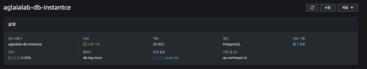 AWS RDS의 프리티어 Postgres를 이용하였고, 프리티어라 DB를 생성할 때 보안그룹 말고는 딱히 신경쓸만한 부분이 없었다.