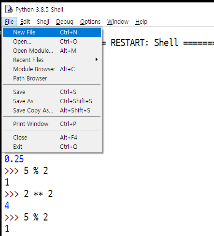 이제 파이썬 파일을 만들어 볼것인데, IDLE 에서 File 의 New File을 눌러보자