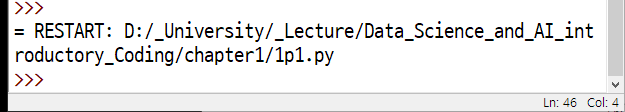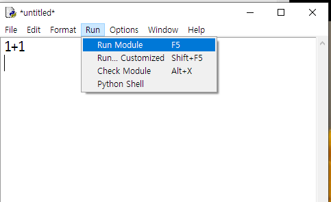 이 IDLE의 '대화형 모드'에서는 1+1 을 하면 2를 바로 출력해주지만, 이를 문서화하여 IDLE에서 실행하면 계산만 하고 출력은 해주지 않기 때문에 꼭 아래와 같은 명령어로 입력해주어야한다. 그리고 Run Module을 다시 눌러보자.