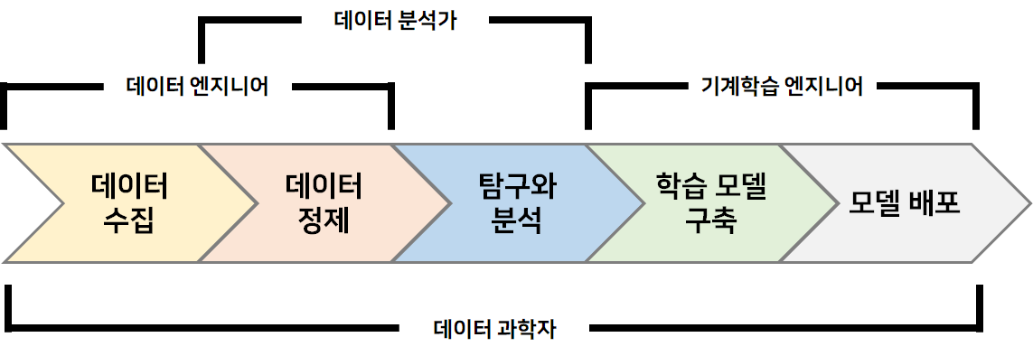 데이터 수집과 정제에 전문적 여량을 가진 사람들을 통칭하여 '데이터 엔지니어'라 칭 할 수 있고, 전통적으로 데이터의 정제 작업부터 분서갂지의 작업에 종사하는 이들을 '데이터 분석가' 라고 한다. 또한 기계 학습을 위한 학습 모델을 구축하고 기계를 훈련시킨 뒤에 학습된 모델을 배포하는 일을 전무적으로 하는 사람들을 '기계학습 엔지니어'라고 한다.